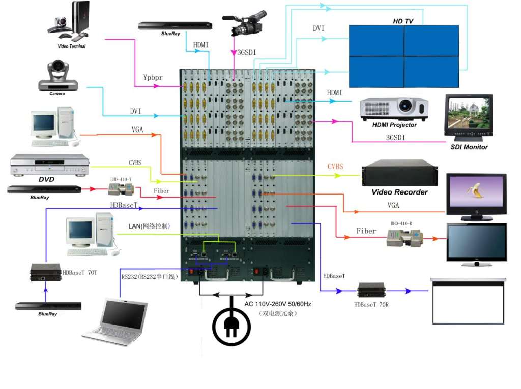 Supports DVI-I/ HD/ 3GSDI/ HDBaseT/ Fiber to mix input and output;